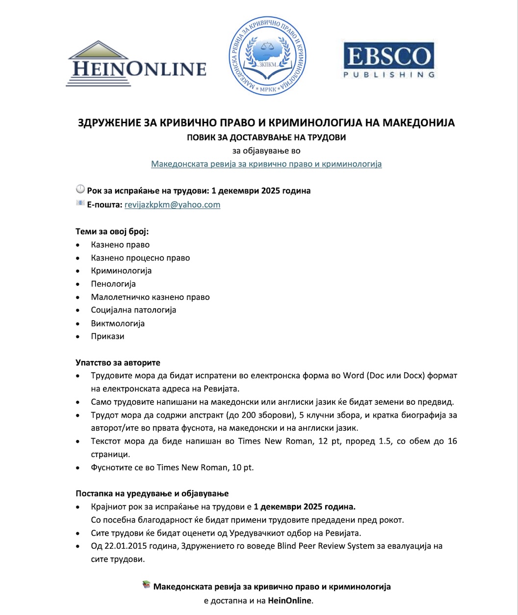 Здружението за кривично право и криминологија на Македонија објавува јавен повик за доставување научни и стручни трудови за објавување во новиот број на Македонската ревија за кривично право и криминологија. Ова списание, со долга традиција на унапредување на правната мисла и криминолошките истражувања, претставува важна платформа за академска и професионална размена во областа на казненото право, криминологијата, пенологијата и сродните дисциплини.